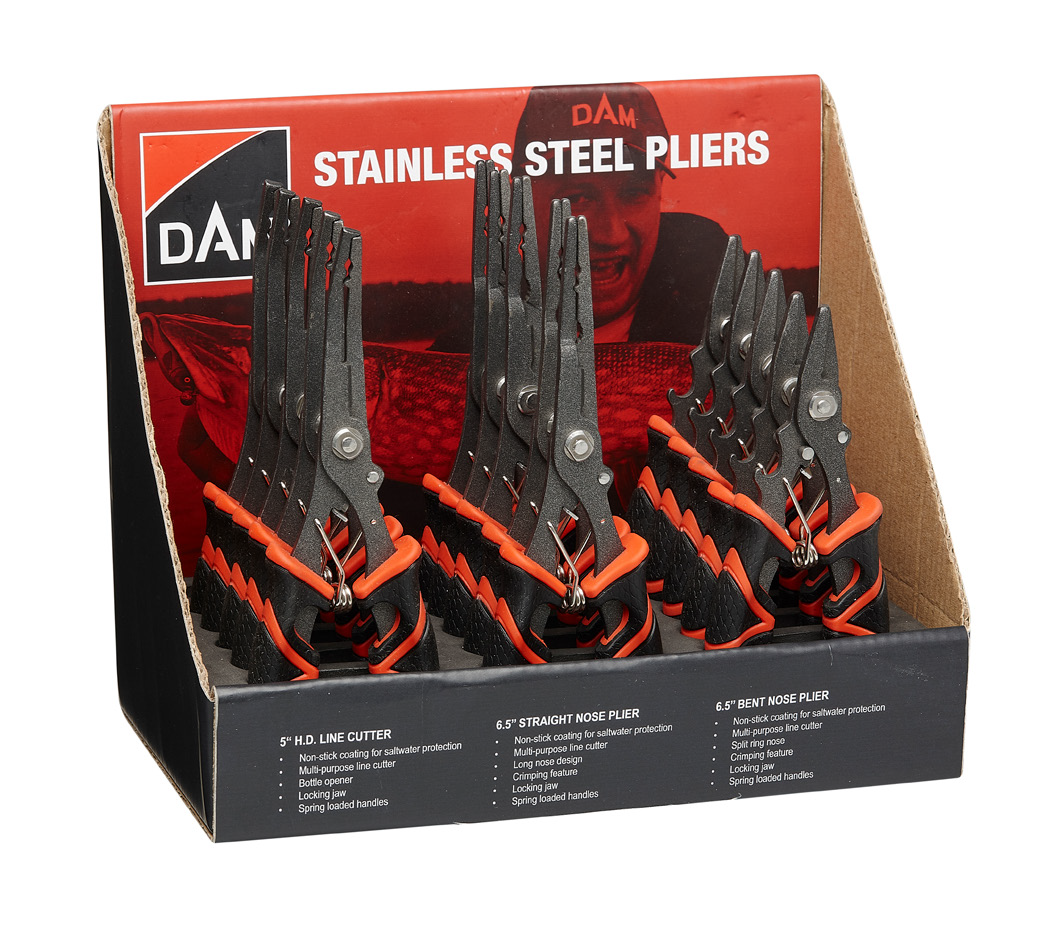 Un display de carton colorat cu trei modele diferite de clești și foarfeci din oțel inoxidabil (total de 18 buc.- 6buc/model).