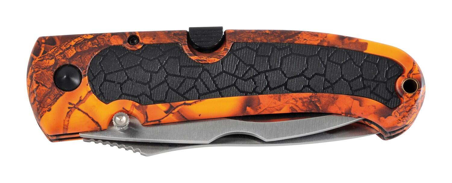 Lama principală măsoară 12 cm, iar mânerul său ergonomic este imprimat camo blaze și are aplicații pentru o prindere fermă.