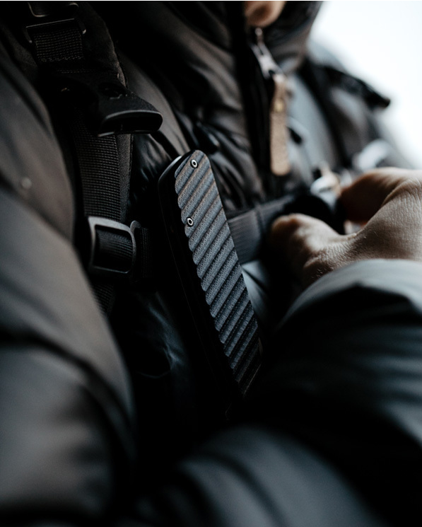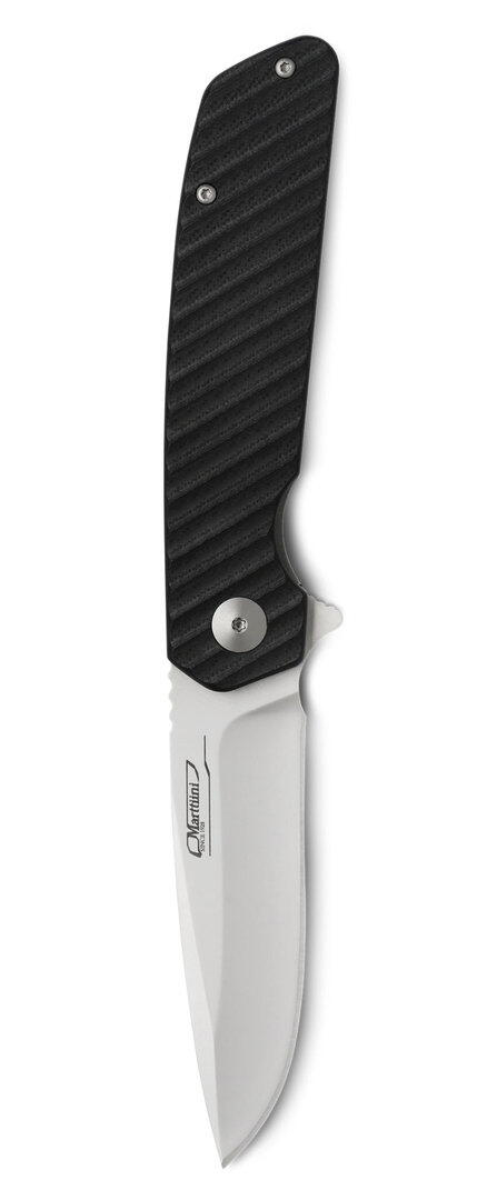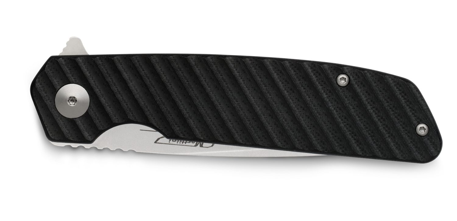 Mânerul G-10 are un grip excelent, iar clema de curea (clip-ul) păstrează briceagul la îndemână în orice moment.