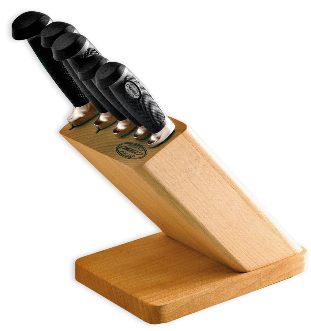 Cuțitele rămân ascuțite și în stare bună pentru o perioadă mai lungă, dacă sunt păstrate în acest suport. Setul conține cinci cuțite: peeling, legume, filetare, pâine și cuțitul bucătarului.