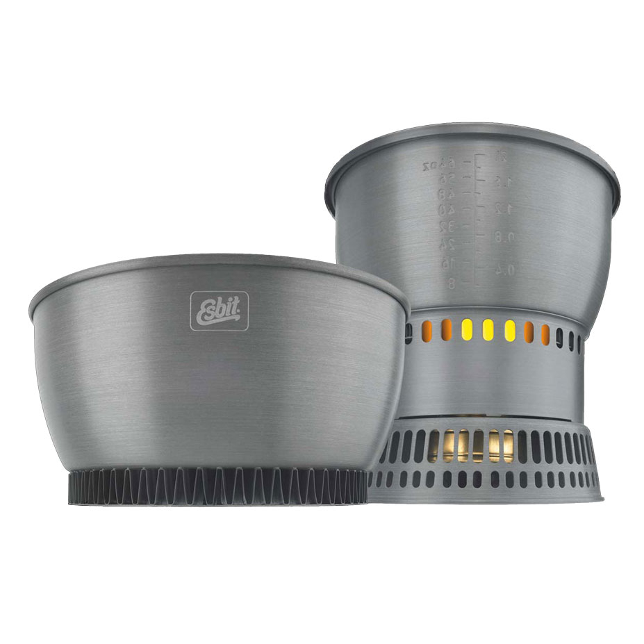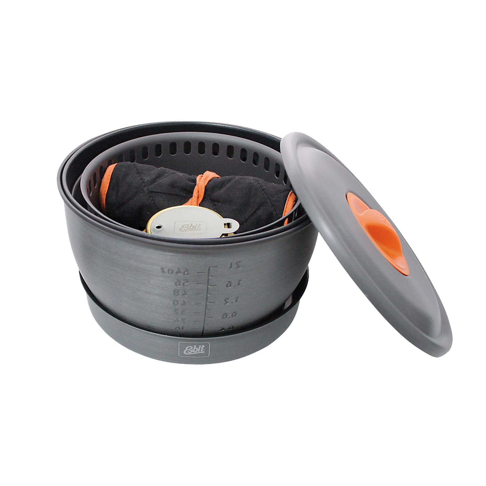 Setul de gătit multi-piesă Esbit este extrem de eficient și compact, în ciuda dimensiunilor sale mari. Acesta include două oale (2,35 l și 1,8 l) din aluminiu anodizat dur, un tigaie cu strat antiaderent și un arzător pe alcool. Setul mai conține o folie de protecție pentru oale, un suport pentru oale, un suport pentru ibric și două farfurii. Acest set de gătit este ideal pentru excursii de până la 4 persoane.