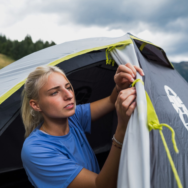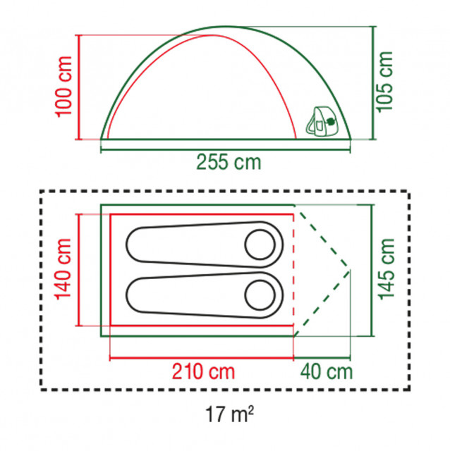 Un cort pentru două persoane, ușor și rapid de instalat cu sistemul de atașare a betelor prin inel și cui. Veranda din față oferă spațiu pentru bocanci plini de noroi și echipament, iar ușa curbata asigură un acces facil. Ușa cu plasă de țânțari ține insectele la distanță.