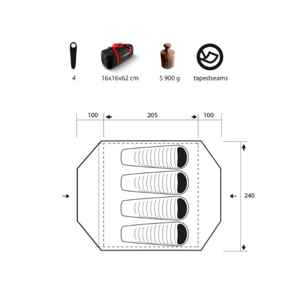 Cort spatios, pentru patru persoane. Constructia clasica cu doua bete este intarita de doua bete suplimentare, care asigura stabilitate chiar si in situatii solicitante. Doua intrari si doua abside spatioase ofera suficient confort pentru gatit si depozitarea bagajelor.