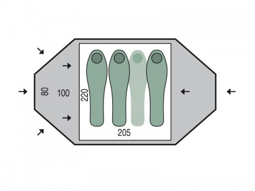 Cortul este dublu-strat, format dintr-un cort interior si foii exterioare. Cortul interior are un plan de podea rectangular cu doua intrari pe laturile mai lungi. Cortul exterior este octagonal si are de asemenea doua intrari, in care se afla doua vestibule, ideale pentru depozitarea bagajelor.