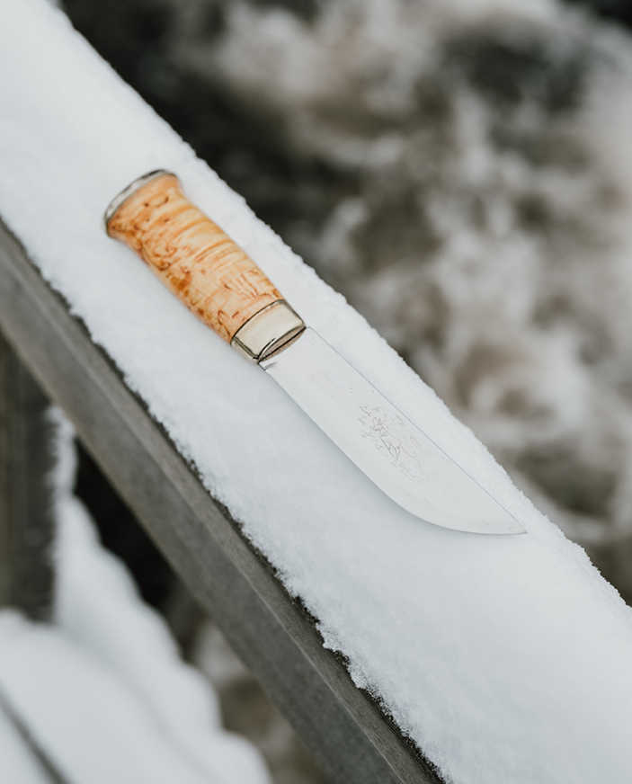 Lama este realizata din otel inoxidabil cromat, rezistent la coroziune, si este decorata cu o gravura fina cu tematica lapona. Teaca impresioneaza prin modelul sau traditional, care reflecta puternica mostenire culturala lapona, completand perfect aspectul clasic al cutitului.