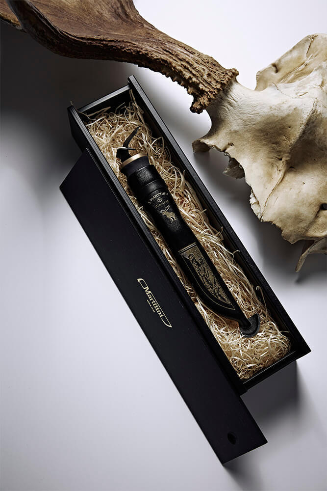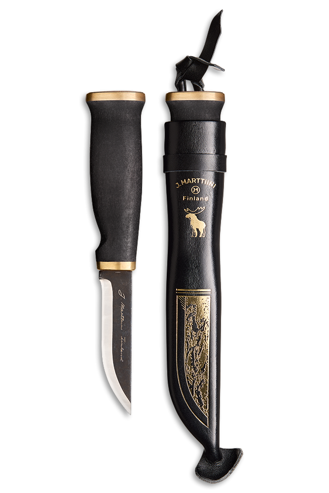 Elanul este o figură valoroasă și respectată în pădurile finlandeze, care nu poate fi niciodată supraevaluată. Elanul în toată splendoarea sa este înfățișat pe teacă în culoare bronz. Mânerul din mesteacăn este vopsit în negru și este acoperit cu un strat de ceară transparent pentru protecție suplimentară. Lama este realizată din oțel carbon. Moose Black vine într-o teacă din piele neagră strălucitoare, tăbăcită vegetal, cu decor auriu.