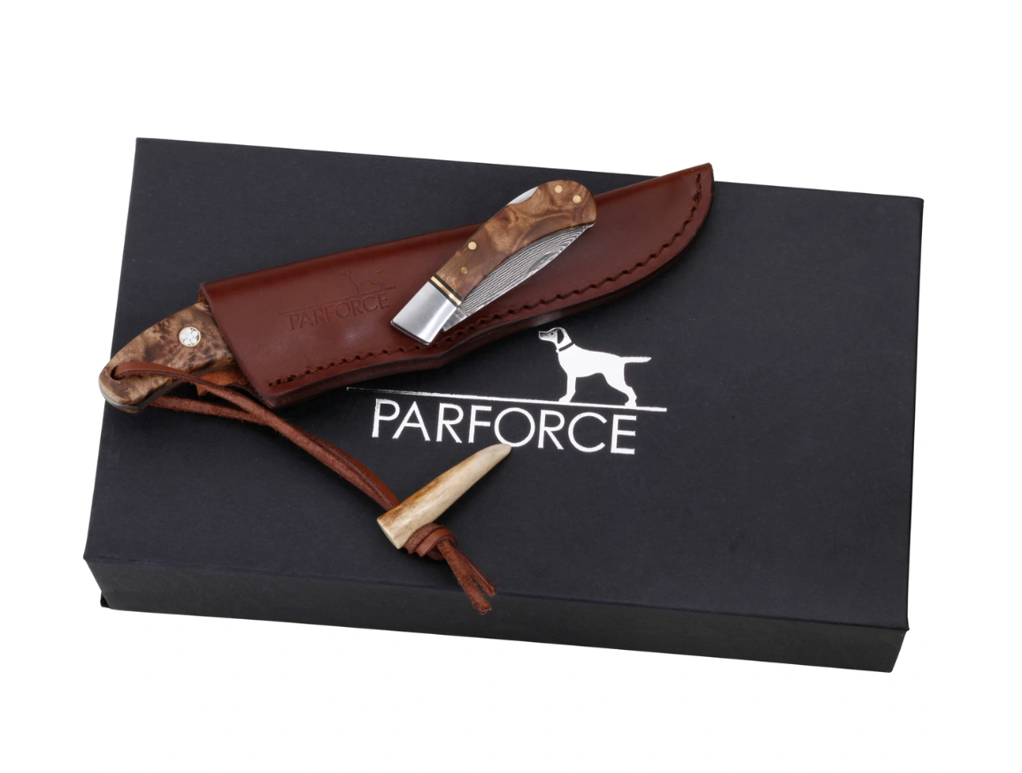 Ambele au plăsele din lemn cu granulație frumoasă, cu știfturi elegante mozaic și straturi intermediare deasupra gărzii din oțel inoxidabil. Cuțitul cu lamă fixă cu o lamă de 9 cm lungime și o lungime totală de 20,3 cm este echipat cu o curea din piele și o teacă de curea din piele.