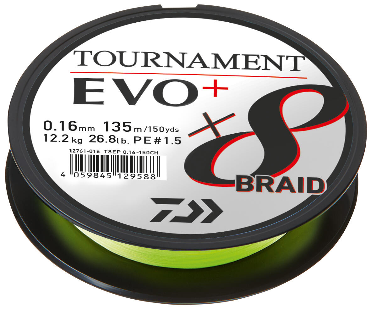 Cunoscutul Tournament 8 Braid a fost optimizat în versiunea Evo +. În special, acoperirea de suprafață a fost îmbunătățită cu o cantitate mai mare de silicon - astfel firul produce o frecare redusă în timpul aruncării și astfel optimizează distanțele de lansare. În plus, zgomotul generat în inele este redus în continuare. Astfel, noul Tournament 8 Braid Evo + este, din punct de vedere tehnic, una dintre cele mai bune fite textile pe piață. Suprafața Evo + nu se desprinde nici măcar la utilizarea frecventă și își menține diametrul rotund. Pentru noul ambalaj, am redus consumul de material plastic cu peste 50%.