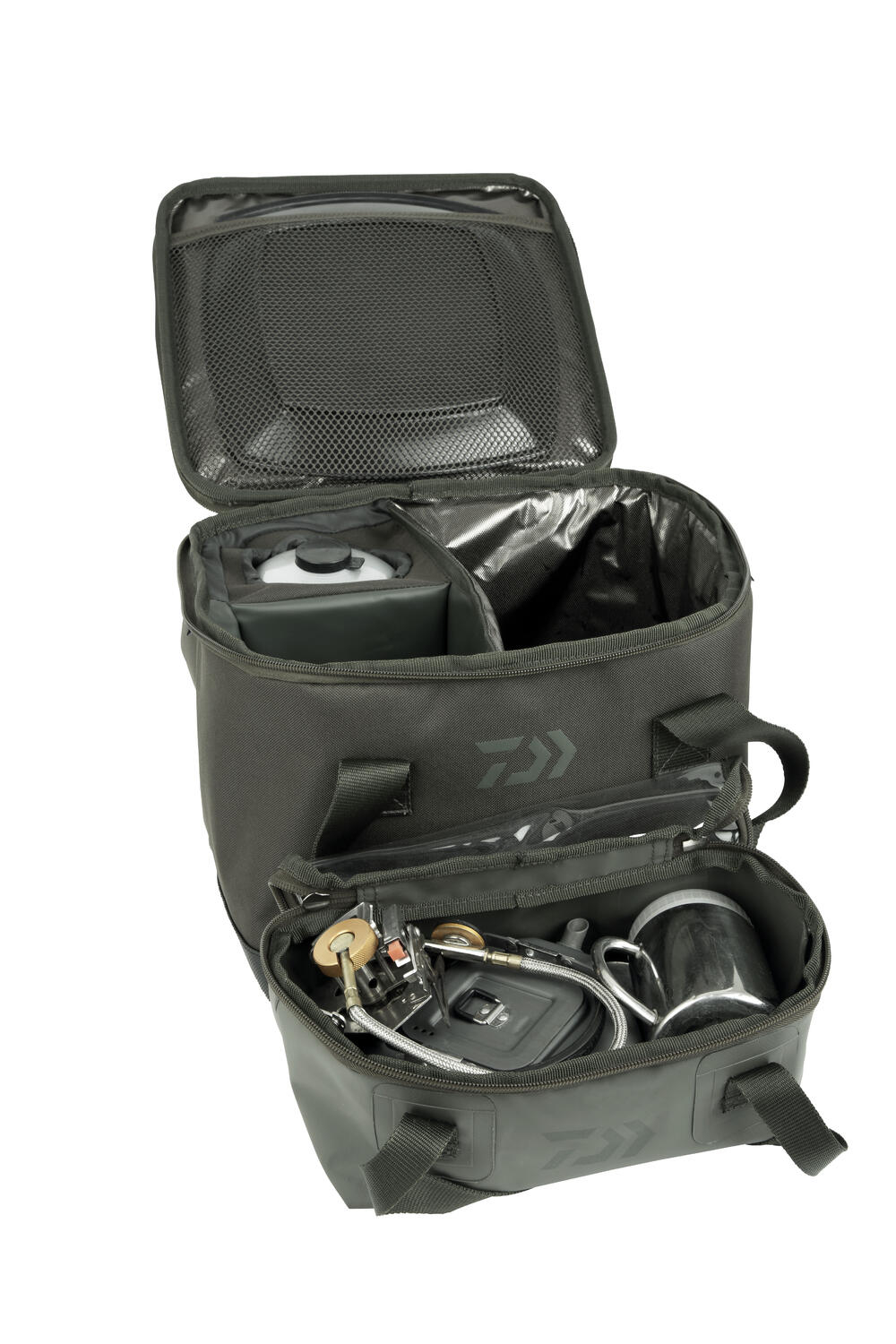 Compartimentul principal este împărțit în trei secțiuni pentru a transporta articole diferite: aragaz, ceainic și recipient pentru gaz. Cele două compartimente interioare de depozitare sunt căptușite cu un material termic ușor de curățat, menținând mâncarea rece și ferită. Plasa din interiorul capacului poate păsrta un tocător la nevoie. Este livrat cu o geantă interioară din PVC pentru a păstra toate elementele esențiale de gătit - aceasta poate fi păstrată separat de geanta principală pentru a asigura igiena.