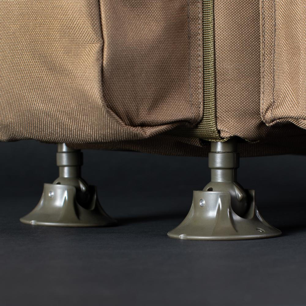 Este susținută de patru picioare de noroi autonivelante. Acest lucru nu numai că menține stabilitatea, dar ridică și baza acestuia de pe sol, făcându-l ideal pentru pescuitul în condiții mai puțin ideale.
