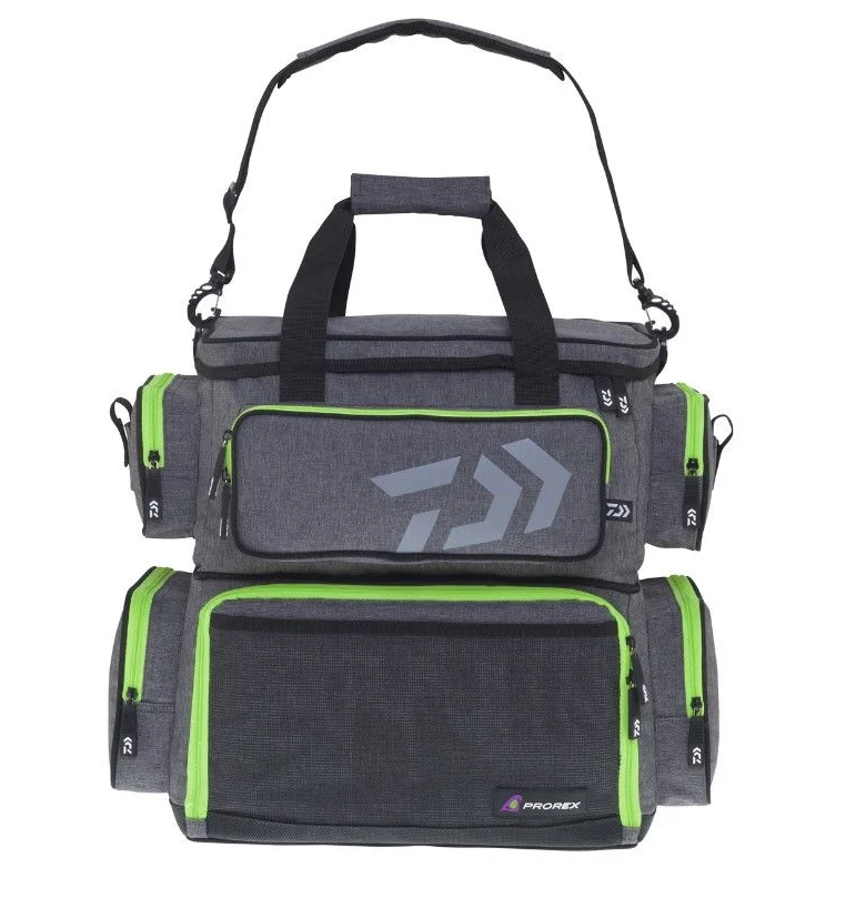 Compartimentul inferior este echipat cu 4 cutii DAIWA mari și oferă suficient spațiu pentru alte cutii mari cu echipament sau mulinete, tamburi, alimente, băuturi, îmbrăcăminte de ploaie etc. În buzunarul din față, puteți păstra clești lungi, documente și altele. Cele 4 buzunare laterale suplimentare oferă spațiu pentru cutii mici, genți pentru leader etc. Fermoarul este realizat din material ABS extrem de rezistent, fără corodare.