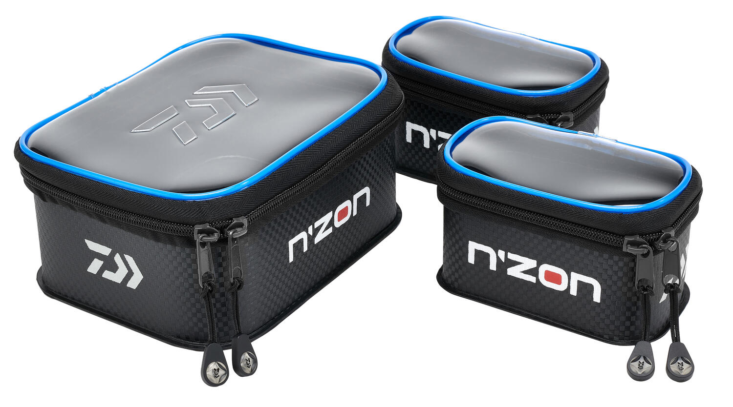 Set de trei piese pentru depozitarea diferitelor momeli, viermi și particule. Cu margini armate si capac cu fermoar. Ambele cutii mai mici pot fi introduse în cea