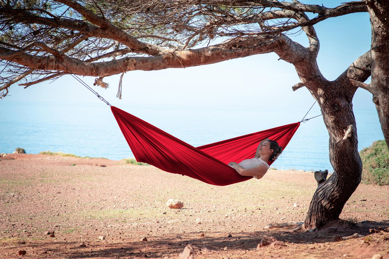 Fabricat dintr-un material ultra-rezistent, respirabil și prietenos cu pielea, hamacul se potrivește perfect oricărui mediu, fie că este vorba de umiditatea junglei sau de aerul uscat al muntelui.