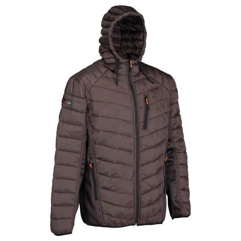 Jachetă de puf, din bimaterial, cu glugă, de culoare maro închis