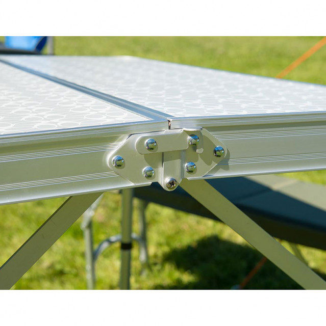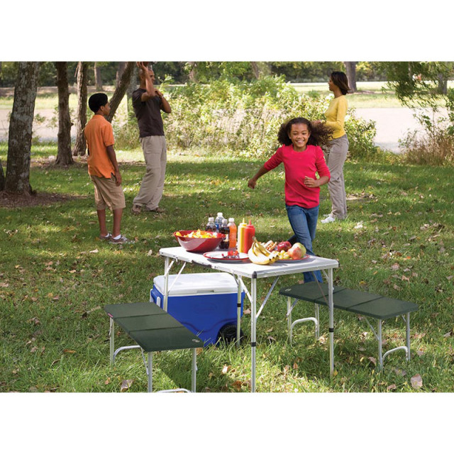 Masa Coleman Pack-Away 4 - 205584 Masa ideala pentru vacantele cu familia. Potrivita pentru patru persoane poate fi stransa foarte convenabil cu bancile in interior. Bancile sunt confortabile gratie pernelor captusite care se pot scoate pentru a fi spalate. Caracteristici: - Masa pentru 4 persoane cu 2 banci; - Pernele bancilor se pot scoate; - Sistem sigur de inchidere; - Rama: Aluminiu; - Material: Poliester 600D; - Dimensiuni masa W x D x H: Intinsa = 90 x 57 x 70 cm / Stransa = 90 x 30 x 9 cm; - Dimensiuni banca W x D x H: 93 x 27 x 40 cm; - Manere de transport; - Greutate: 10.5 kg; Garantie 24 luni