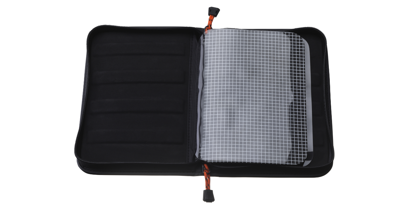 Penar premium cu aspect fibră de carbon pentru depozitarea lingurițelor mici pentru pescuitul la păstrăv. Lingurile pot fi fixate orizontal sau vertical. Stratul interior de