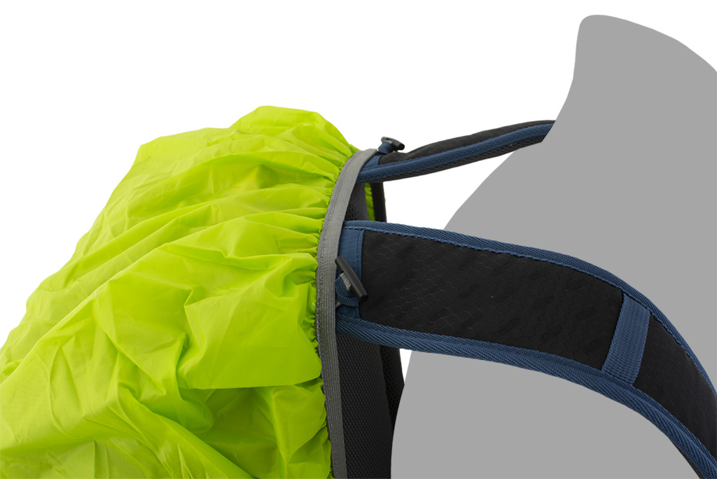 - Husă de ploaie integrată: Stocată într-un buzunar separat pe partea inferioară a rucsacului.