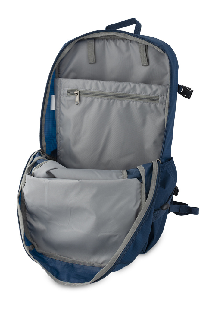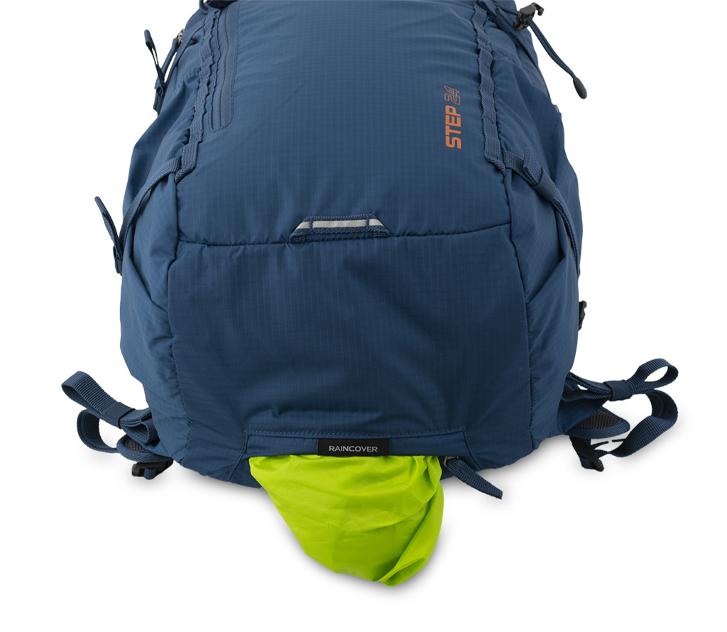 Husa de ploaie distinctiva, depozitata intr-un buzunar cu fermoar in partea de jos a rucsacului.