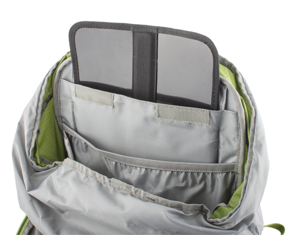 Compartiment principal spatios, cu acces superior, securizat cu snur si frana, protejat de capacul rucsacului cu fermoar.