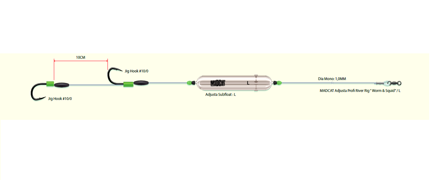 Montură cu un subflotor MADCAT® Adjusta, pentru pescuitul pe fund în curent, cu viermi și/sau fâșii de calmar. Legat cu firul Mono Leader MADCAT® Ultra-soft de 1,00 mm grosime.