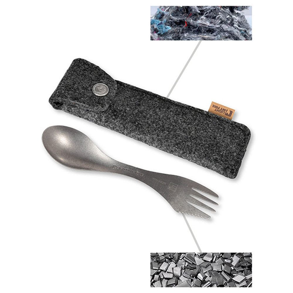 Contine: lingura, furculita, partea de furculita este zimtata si se poate folosi ca si cutit. Husa de transport din lana reciclata.