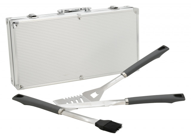 Setul include o spatula cu o margine slefuita care are o margine zimtata, un desfactor de sticle si gauri de scurgere a grasimii. Clestele, special modelat pentru o prindere eficienta a diverselor feluri de mancare, perie pentru intretinerea gratarului. O componenta indispensabila a setului pentru gratar este si o furculita, o perie, un cutit si 4 bete metalice pentru frigarui.